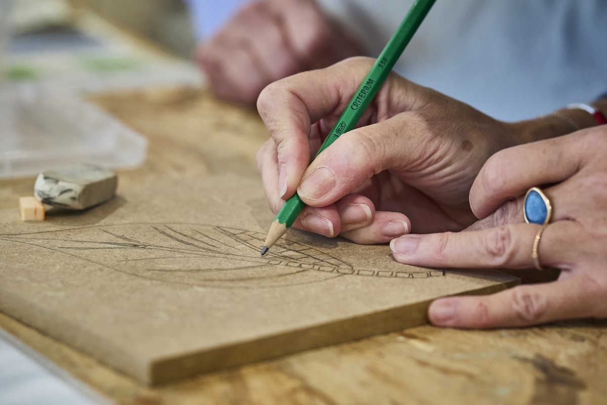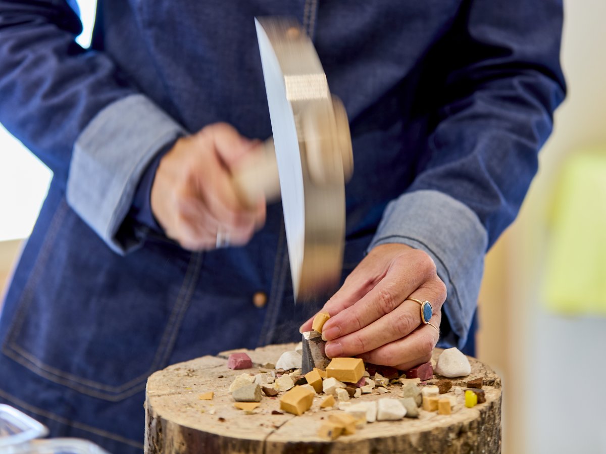 Carole travaille avec des outils traditionnels comme la marteline et un billot avec tranchet, afin de donner dans ces compositions un résultat tout à fait unique. Ses compositions sont habillées de matières qui invitent à un voyage où chacun retrouve son histoire.